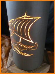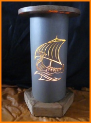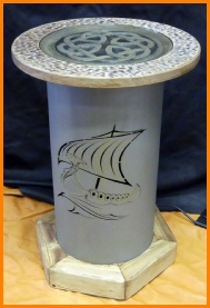 Balkensockel aus Fichte, LED Beleuchtung mit Fußschalter, Korpus aus Metall leicht angerostet.